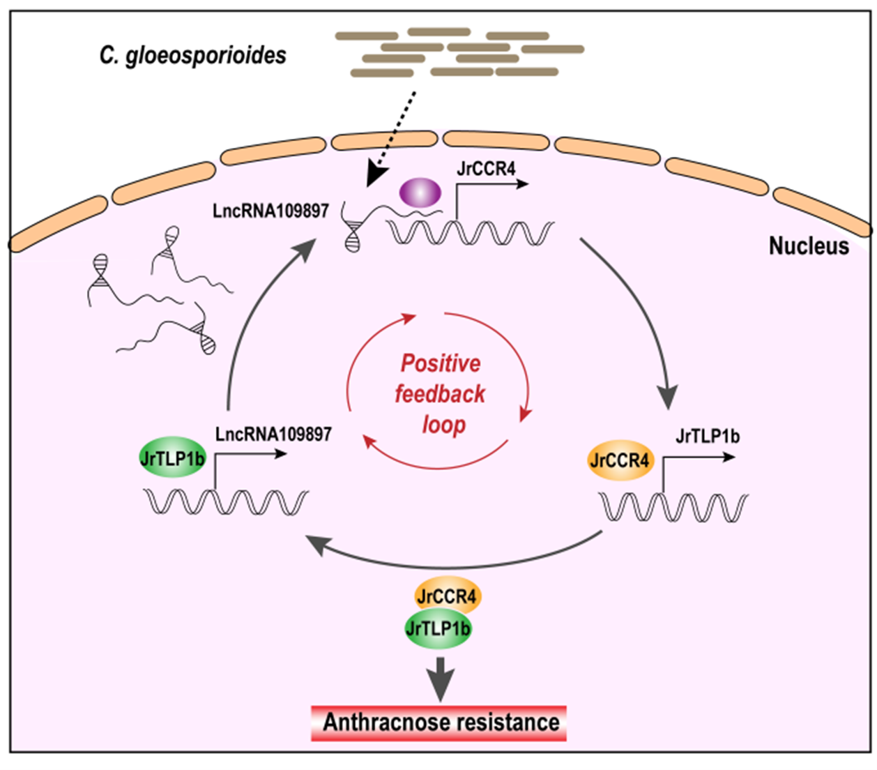 LncRNA 及其靶基因在植物抗病的先天免疫过程中发挥着重要作用。杨克强/房鸿成团队通过转录组分析和 qRT-PCR 筛选到一个与核桃抗炭疽病显著相关的lncRNA109897 及其靶基因 JrCCR4。团队以JrCCR4 蛋白作为诱饵,Y2H 筛库实验发现JrTLP1b 为JrCCR4 的潜在互作蛋白;Pull down 和BiFC 实验反向验证了JrCCR4 与JrTLP1b 的互作关系。利用体外蛋白降解实验和LUC 实验证明JrCCR4 不仅可以稳定JrTLP1b 的蛋白活性,还可以激活 JrTLP1b 的转录。同时, JrTLP1b 能够诱导 lncRNA109897 的表达并激活 lncRNA109897 启动子的转录活性。在核桃叶片中的瞬时转化和对拟南芥的稳定遗传转化实验均证明了lncRNA109897、JrCCR4 和JrTLP1b 可提高转基因叶片对胶孢炭疽菌的抗性。这些研究结果阐明了 lncRNA109897-JrCCR4-JrTLP1b 以正向反馈环路调控核桃对炭疽病抗性,拓展和深化了核桃对炭疽病抗性的认识,也为核桃抗病聚合育种提供了思路。